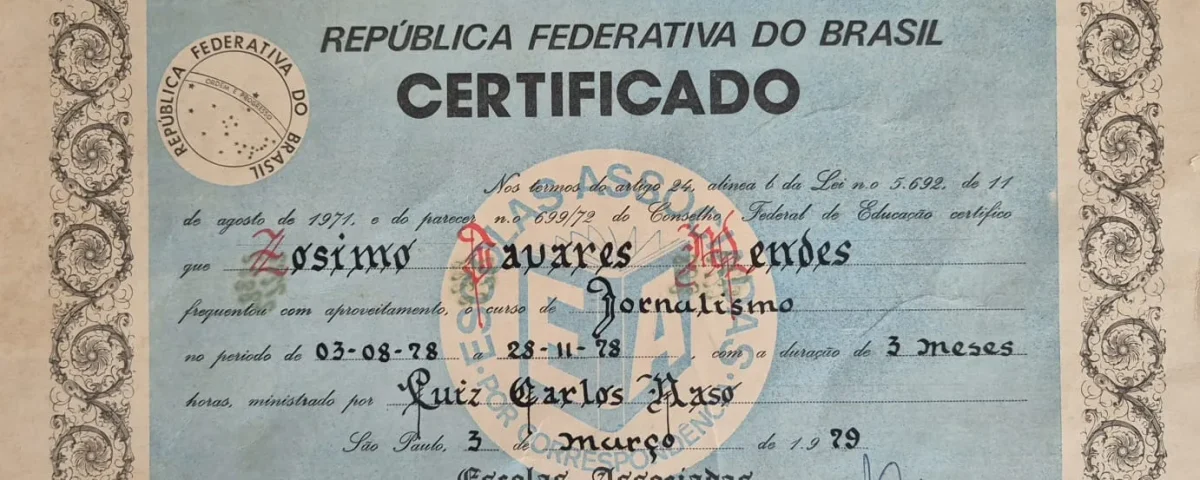 O certificado do curso de jornalismo por correspondência/Imagem: Acervo do autor.